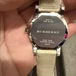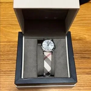 Stylish Burberry watch with a silver face. Features a distinctive checkered strap. Perfect for any occasion.