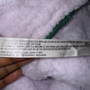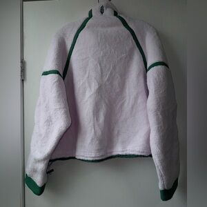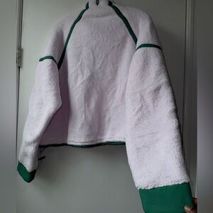 Plush white fleece interior with green trim and zipper detail. Soft, cozy texture ideal for layering. Sporty, casual style with branded accents.