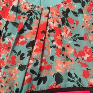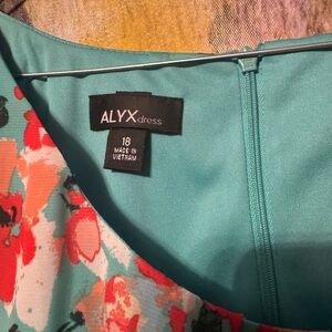 Vibrant Alyx dress with floral pattern. Features teal and red hues. Bottom is a dark navy denim. Red belt and matching red shoes size 7 included. Smoke and pet free home. Size 18z