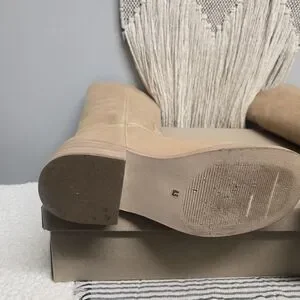 Steve Madden knee-high boots in tan leather. Smooth leather upper with a stacked low block heel for everyday comfort. Classic round toe and clean stitching for a versatile look. Easy to pair with jeans, skirts, or dresses.
