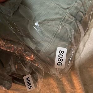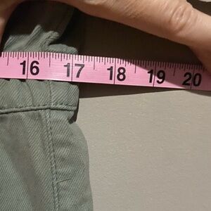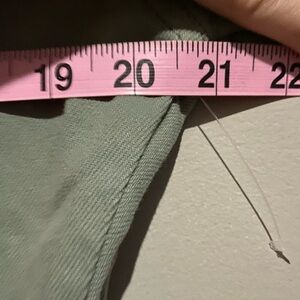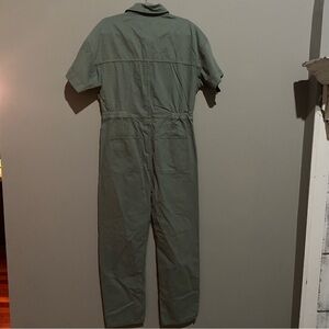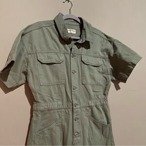 Stylish sage green jumpsuit. Features button-up front and short sleeves. Relaxed fit.