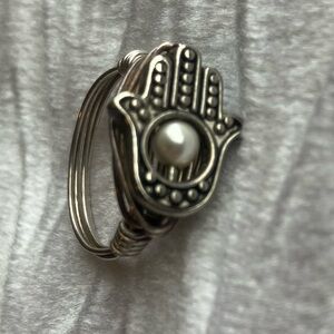 SilverTone Wire Wrap Hamsa Hand Ring with Pearl Accent