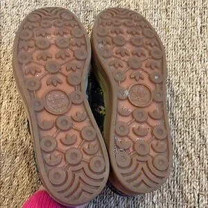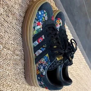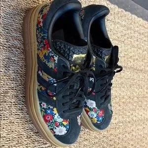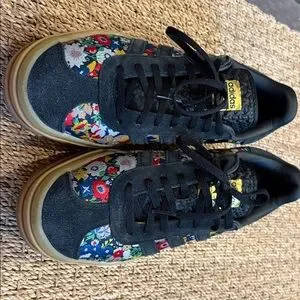 Low-top adidas sneakers with black suede overlays. Colorful floral fabric panels across the upper. Gold adidas tongue label for a subtle accent. Black laces and gum-colored sole.