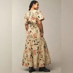 Anthropologie The Somerset Maxi Dress Cotton Tiered Size Small Khaki Floral