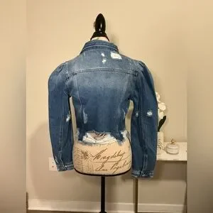 NWT Stylish distressed denim jacket with button closure and puff and balloon sleeve Features a frayed hem. None stretchy material fits like a small.