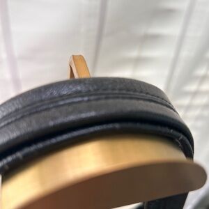Trim & Hardware: Accented with black patent leather straps and polished gold-tone (brass) hardware.
