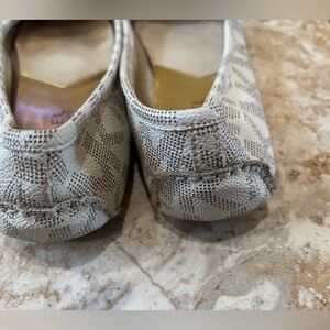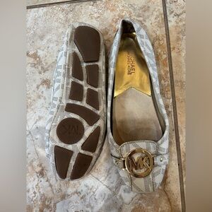 Classic Michael Kors ballet flats in white with signature MK pattern. Gold-tone MK medallion and hardware accent the toe. Leather-lined interior for comfort. Versatile, polished style for everyday wear.