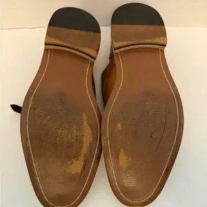 Sleek tan leather Oxfords with buckle detail. Ideal for formal and casual wear. Normal wear noted on soles, excellent shoes.