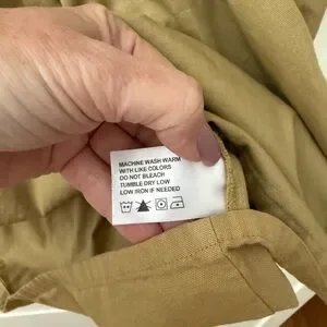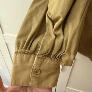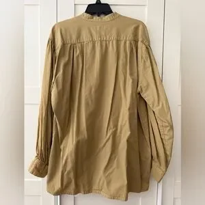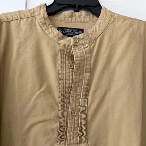 Soft tan/brown henley-style tunic. Features pintuck detailing at the placket and gentle front pleats. Long sleeves with button cuffs. Heavier weight 100% cotton fabric, relaxed fit. Versatile wardrobe staple. J. Peterman company was made a household name by Elaine from Seinfeld, when she worked for the company.