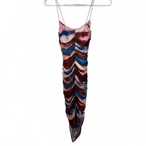 Fashion Nova Ruched Bodycon Midi Dress Pink Blue Abstract Print XS