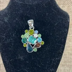 Eye-catching multicolor crystal pendant with mixed blue, green, teal and amber stones. Polished silver-tone setting enhances each sparkling gem. Versatile statement piece that complements both casual and dress looks. Lightweight design for comfortable all-day wear. I believe this is Lia Sophia but I don’t see it marked.