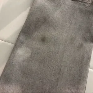 From a clean, smoke-free home. Price has been reduced due to discoloration on the back of the lower left pant leg. The darker spots may be removable, though the lighter spot is likely permanent. I’ve worn them multiple times since and when cuffed, the discoloration isn’t noticeable at all.
