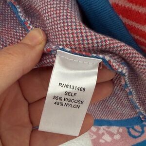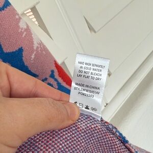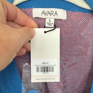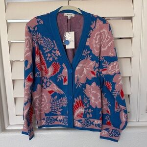 Avara blue cardigan with pink floral and bird jacquard. Button-front V-neck and long sleeves for easy layering. Lightweight knit with bold, feminine colorblocking. Perfect for adding a playful, polished touch to casual outfits. NEW WITH TAGS. Large.