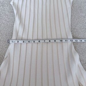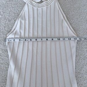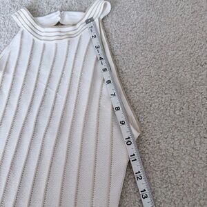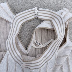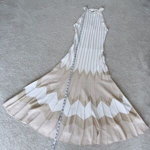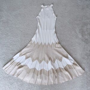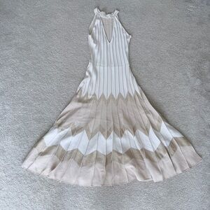Keywords: anthropologie dress, by anthropologie dress, knit midi dress, pleated midi dress, chevron dress, beige midi dress, neutral dress, fit and flare dress, drop waist dress, high neck dress, halter style dress, sleeveless midi dress, elegant midi dress, wedding guest dress, bridal shower dress, special occasion dress, feminine dress, classy dress, womens size small dress, elevated basics dress