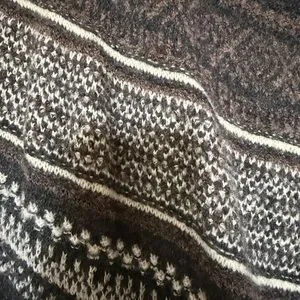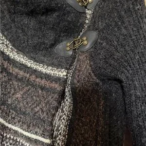 Lightweight knit cardigan with mixed striped panel. Asymmetric front with decorative buttons. Fringe along hem for boho flair. Long sleeves and open drape for layering.