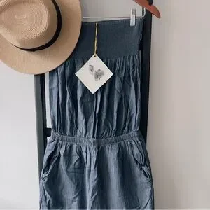 Stylish chambray jumpsuit. Sleeveless design. Comfortable fit.