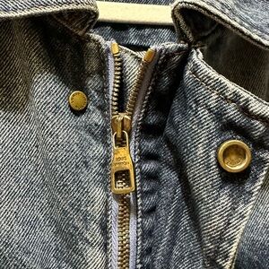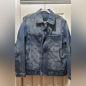 Stylish blue denim jacket with embossed logo details. Perfect for casual wear.