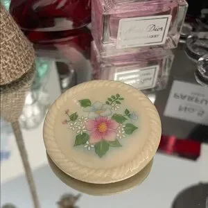 Round AVON Brooche with floral design. Features pink, blue, and green flowers on a cream background.