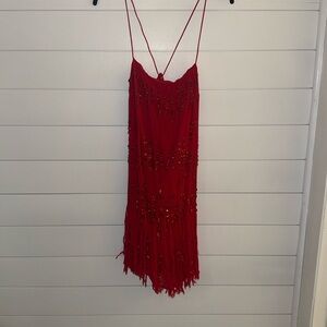 Eye-catching mini slip dress with thin double spaghetti straps. Covered in shimmering sequins and playful fringe. Flowy silhouette that moves with each step. Perfect for parties and nights out.