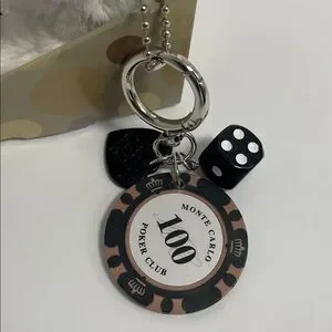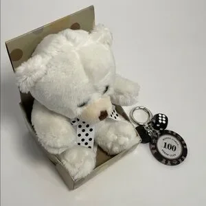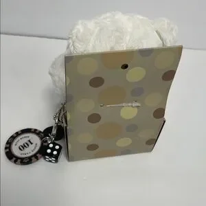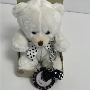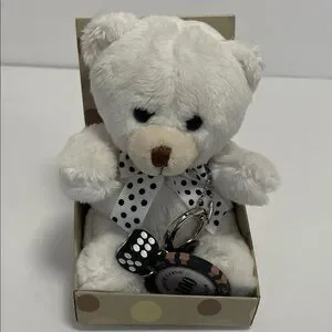 White bear with brown nose plush and black & white polka dot bow paired with unbranded Monte Carlo poker chip and die with silver tone carabiner and bead ball chain