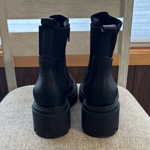 Stylish black ankle boots with ribbed sides. Features a chunky heel and convenient side zipper.