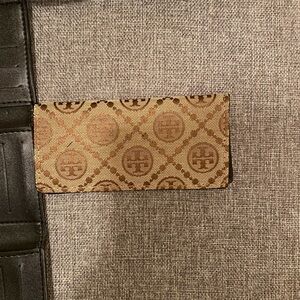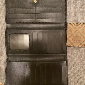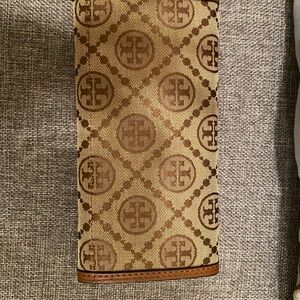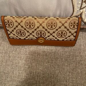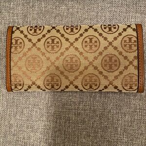 Signature Tory Burch logo jacquard fabric with tan leather trim. Gold-tone logo emblem on front. Slim continental silhouette with card-friendly layout. Elegant neutral tones for versatile wear.