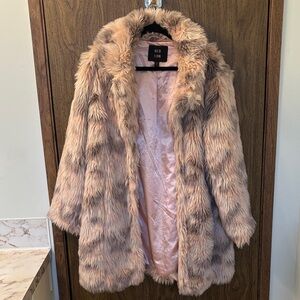 Soft blush faux fur teddy coat by QED London. Plush texture with smooth satin lining. Cozy oversized silhouette for easy layering. Versatile statement piece for cold weather.