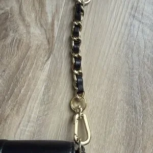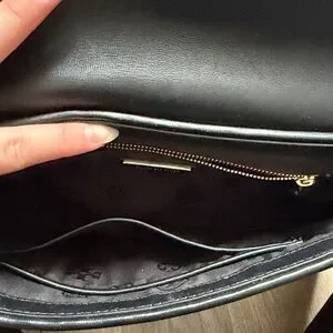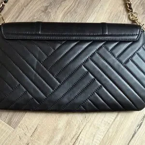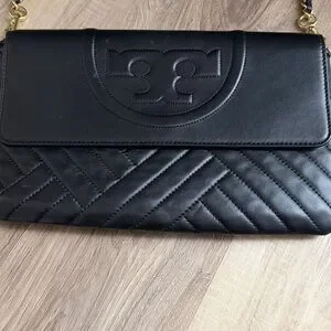 Elegant black leather shoulder bag with quilted lower panel. Features embossed Tory Burch logo on flap. Gold-tone chain and leather strap for versatile wear. Secure flap closure and streamlined silhouette.Smoke free home