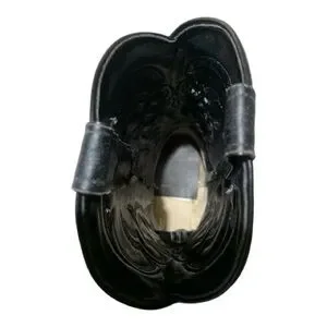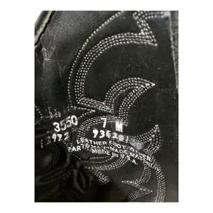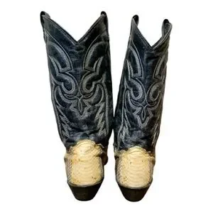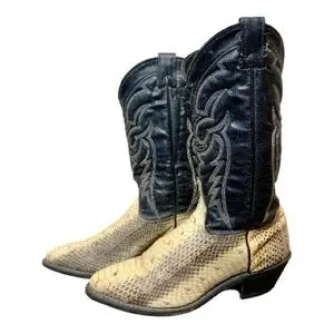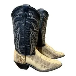 Pre owned with some wear. Classic Western boots with textured cream python skin foot. Tall black leather shafts with decorative stitching. Pointed toes and stacked heels. Stylish cowboy boot silhouette.