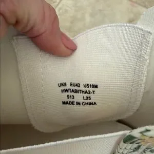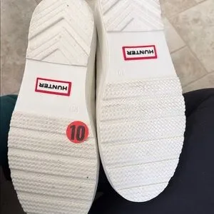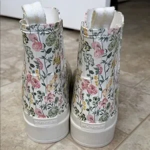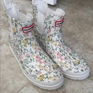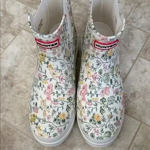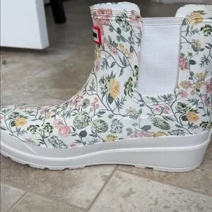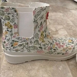 Chic Hunter boots with a floral design. Features pink, yellow, and green flowers on a white base.