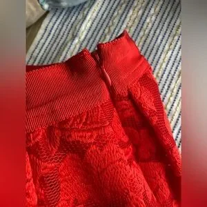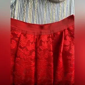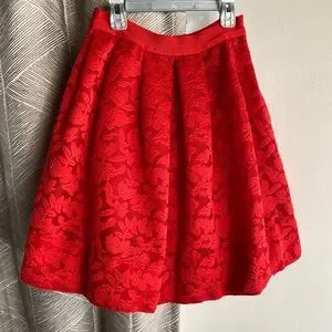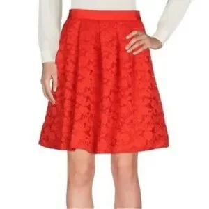 Full circle skater shape with floral lace overlay. Wide waistband for a clean fit. Feminine and flirty style for daytime or evening wear.