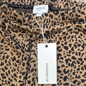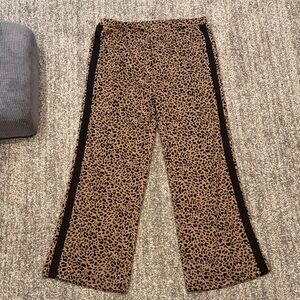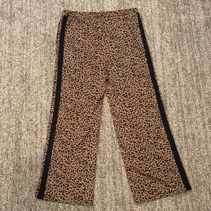 Straight leg pants with all-over leopard print. Elastic waistband for easy wear. Black side stripe detail. Soft, flowy fabric.