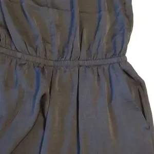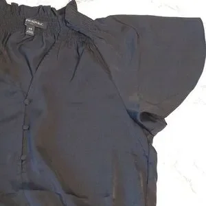 Beautiful black lightweight jumpsuit with elastic at waist, smocked ruffled neckline, wide legs, and 2 pockets, size XS.