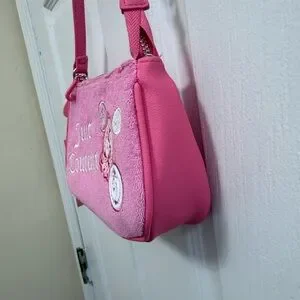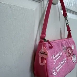 Small Juicy Couture wristlet bag in bright pink. Embroidered logo and crest patches on front. Suede-like texture with zipper top and short strap. Detachable charm detail at side.