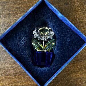 This retired Swarovski Crystal Moments daisy (or marguerite) figurine is part of the "Happy Flowers" collection. It is made of clear crystal, peridot (green) crystal for the leaves, and jonquil (yellow) crystal accents. I was designed by the Swarovski development team and measures approximately 2 inches (50mm) tall.