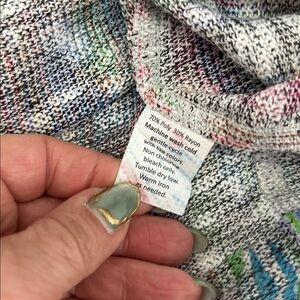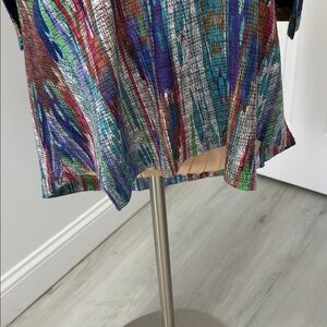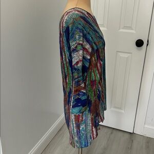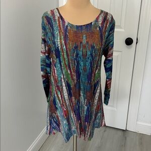 Lightweight knit tunic with multicolored abstract design and uneven hemline. NWOT