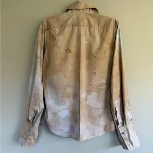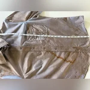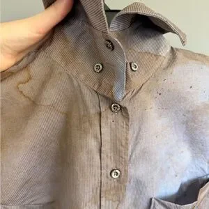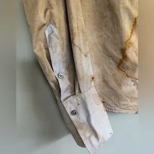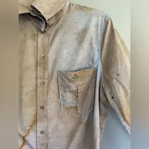 Cotton oxford cloth shirt. Distressing and smudging throughout.