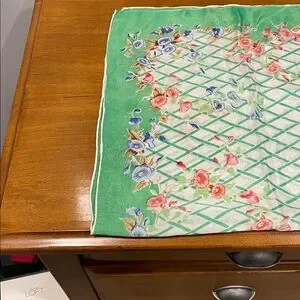 Vintage Lightweight floral scarf with mint green border and lattice pattern. Coral and blush flowers with blue accents. Soft drape and vibrant colors. Versatile accessory for any outfit. Sheer material. No tags/ material information.