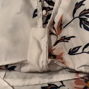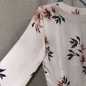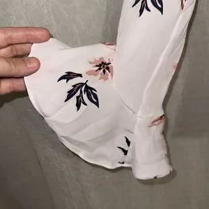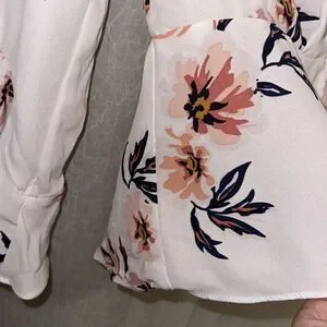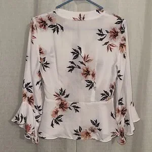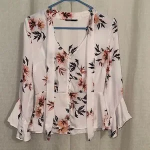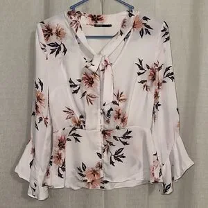 TOKITO 4 White Pink Navy Floral Button Front Bell Sleeve Peplum Tie Blouse