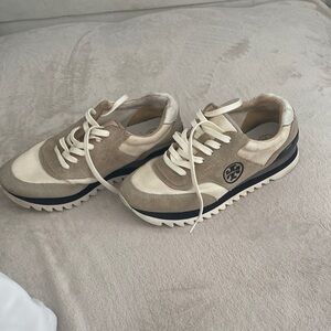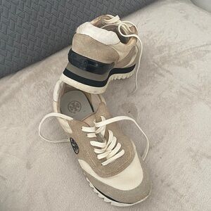 Tory Burch lace-up sneakers in cream mesh and beige suede. Signature logo on the side. Contrasting black midsole stripe and ridged sole. Sporty, versatile style.with a good wash ir looks like new