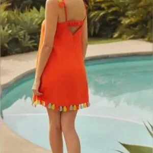 Brighten up your summer wardrobe with this playful Anthropologie mini dress! Featuring a classic shift silhouette in a bold orange hue, this dress stands out with its multi-colored tassel fringe detailing along the shoulder straps and bottom hem.