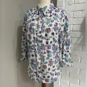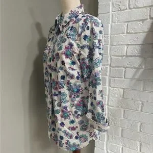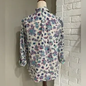 Talbots casual button-down with vibrant floral pattern. White base with teal and purple motifs. Classic collared design and long sleeves. Lightweight, easy-to-layer piece for everyday wear. Excellent condition and closet kept in a smoke free home.