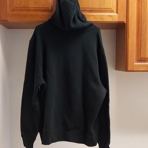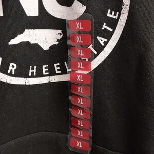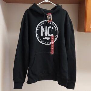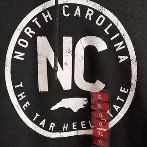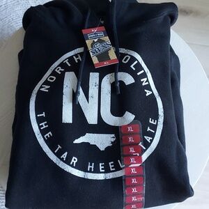From my closet of "never worns", this is a brand new fleece lined black hoodie featuring North Carolina NC The Tar Heel State. Living in Florida, the weather hasn't really allowed me to take advantage of hooded long sleeve pullovers like this one. It is extremely nice with the graphic of the state outline, the NC initials and then NORTH CAROLINA THE TAR HEEL STATE in white. A kangaroo pocket, drawstring hood and fleece lining make this a great addition to cool weather wear. Men's size LARGE. Clean, smoke free home. All sales go toward repaying my daughter's student loans. Thanks for looking.