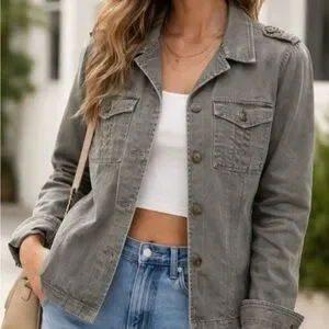 Knox Rose Military Style Jacket Sz Med. Pockets Utility Stretch Jean Stylish gray utility jacket by Knox Rose. Features button front and chest pockets. Ideal for casual wear.