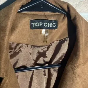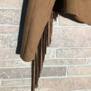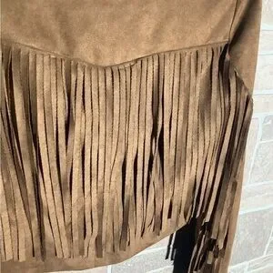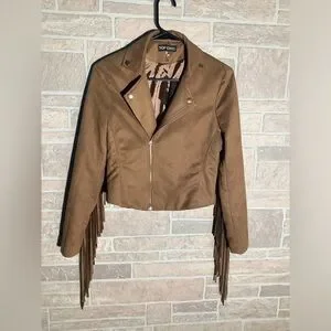 TopChic - Sz S - faux leather suede fringe fashion jacket - tan - 10” fringe