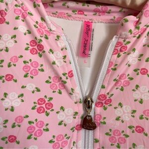 Betsey Johnson long-sleeve rashguard swimsuit in pink with a small floral print. Front zipper closure for easy on and off. Provides sun coverage and stretch for active wear. Fun feminine design by Betsey Johnson. 86% Nylon 14% spandex