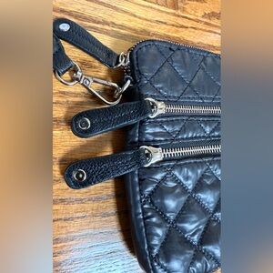 Elegant black crossbody bag with quilted design. Features zipper details for added style.