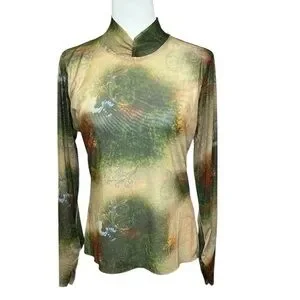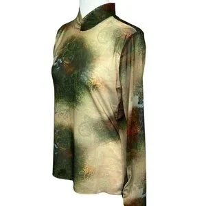 This elegant women's top features a beautiful blend of green, brown, and cream colors, perfect for any occasion. The stylish design offers a comfortable fit and a chic look.