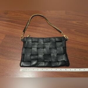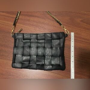 Amazing soft black leather woven leather on one side solid on the other handbag clutch purse. It could be used as a wristlet as well. Just depends on how you use the strap. Please look at all pictures as they are part of my description and you will find measurements there as well . If you have questions, please ask them in the comments. I am happy to help