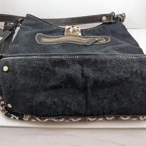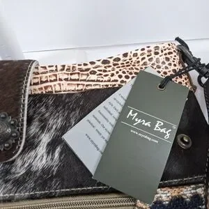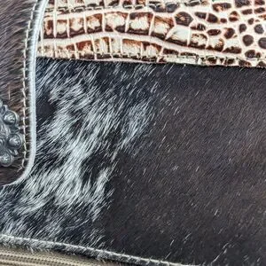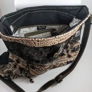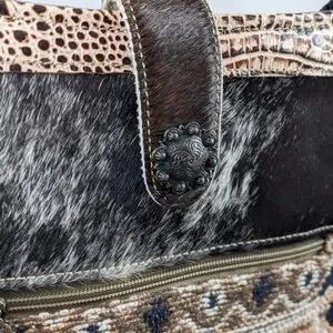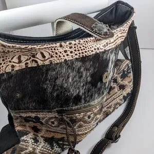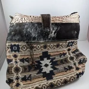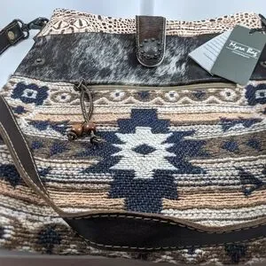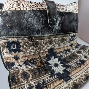 Western inspired crossbody with Aztec woven rug pattern. Mixed materials include hair-on hide and textured trim. Front zip pocket and decorative bead tassel. Earthy tones pair with dark leather details. Please read my screenshot of Details for this Myra Bag!